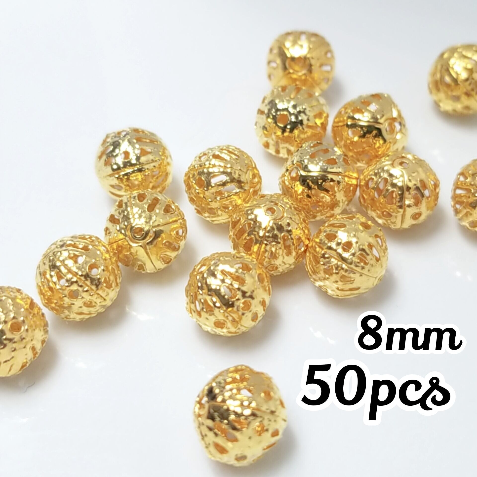 商品名:透かしビーズ サイズ:直径約8mm、ホール1mm カラー:ゴールド 数量:50個 ※計量のため多少前後します 仕様:アイアン製