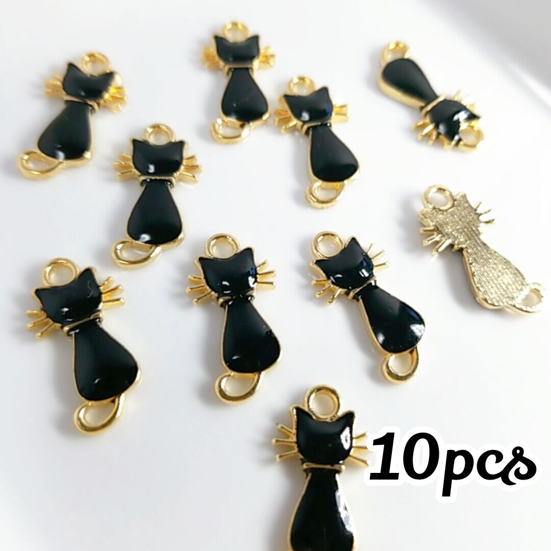 商品名:猫チャーム カラー:ブラック×ゴールド サイズ:縦約22mm×幅12mm×厚3mm、ホール2mm 数量:10 ※海外製となります。 色ムラ、塗装のハミ出し等、個体差がある場合があります。