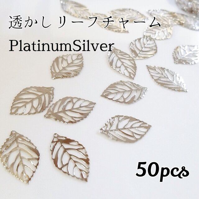 商品名:透かしリーフチャーム カラー:プラチナシルバー 取扱カラー: ゴールド、ホワイトシルバー、プラチナシルバー サイズ:縦24mm×横14mm、ホール約1mm 仕様:アイアン製 数量:50 ※計量のため多少前後します